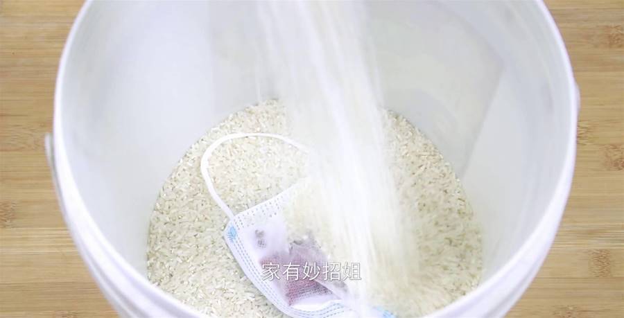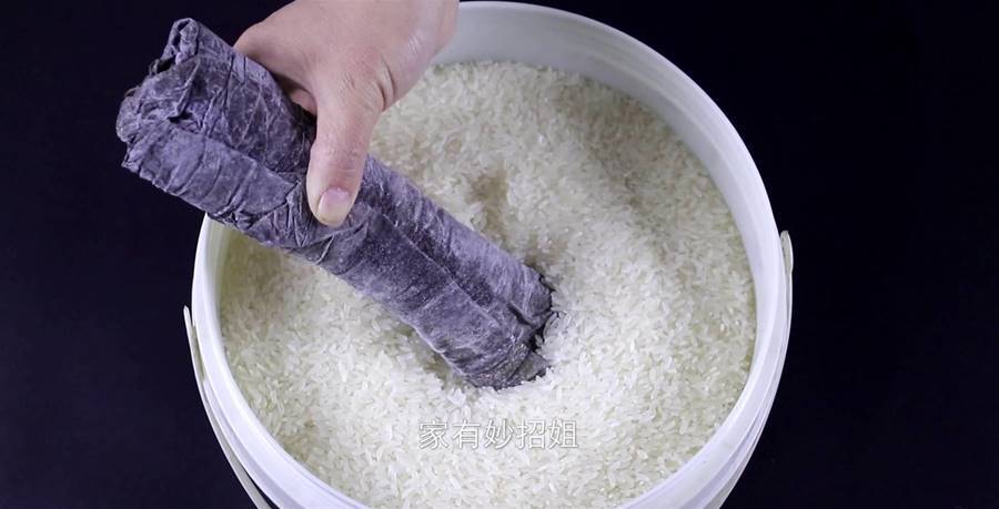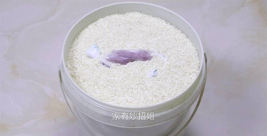接下來,我們只需要把它埋進大米里面就可以了,要是大米比較多的話,我們也可以多制作上幾個,在大米的底部、中間、表面各放上一個。花椒和干辣椒散發出來的刺激性氣味,就能有效的預防大米生蟲,方法簡單有效。