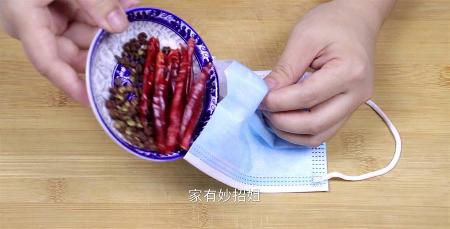 花椒和干辣椒是我們家里常備的調味料,其實也可以利用它們來預防大米生蟲。只需要拿上一個一次性的口罩,用剪刀將口罩的一端剪開,然后抓一把花椒和干辣椒放在口罩里面,接著再將口罩的袋口扎緊,那麼這樣一個預防大米生蟲的口罩包就制作好了。
