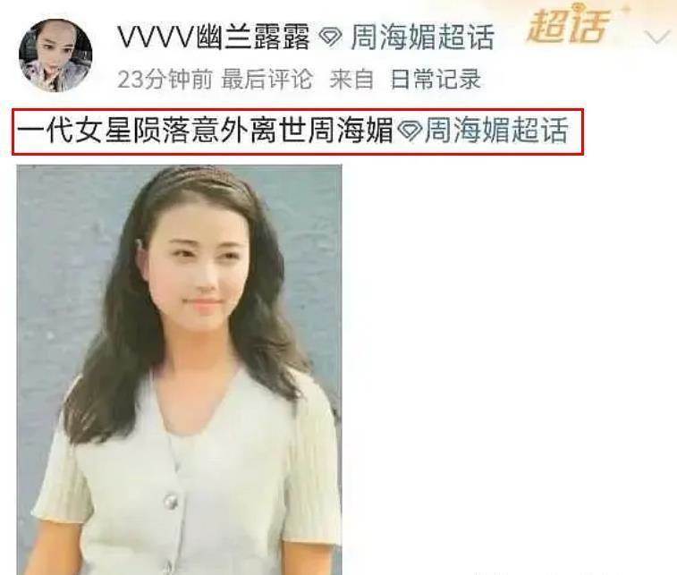 一位網友在周海媚的超話爆料周海媚因意外離世。但是周海媚近期頻繁更新社交賬號,很多人表示難以置信。12月6日,周海媚還發布了57歲慶生視訊。