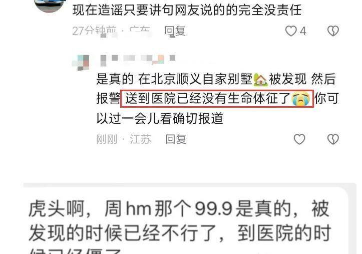 不過有網友爆料周海媚確實已經去世,她是在北京順義自家別墅被發現,然后報警。被發現的時候已經不行了,到醫院的時候已經沒有了生命體征。