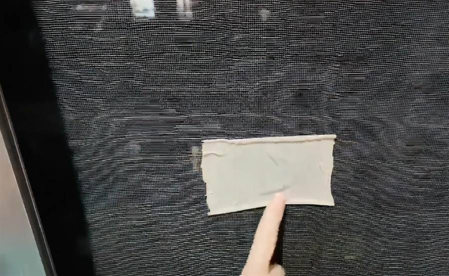 然后在剪下來的絲襪上粘上一圈雙面膠就可以了,剪下來的絲襪一定要是完整的才行。最后撕掉膠紙,把剪好的絲襪貼在紗窗破洞的地方,