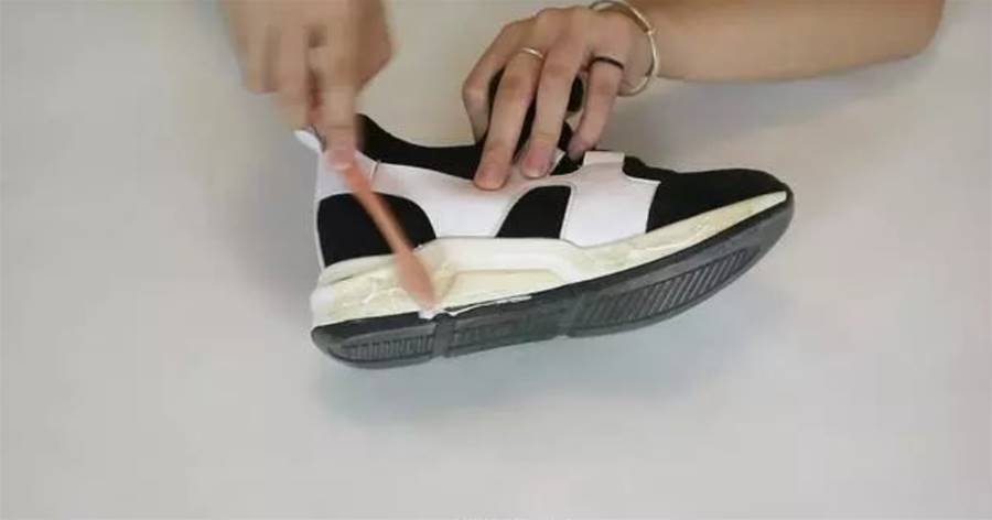 把牙膏擠到這一個鞋子的邊緣處,然后我們就可以拿起我們的牙刷或者是我們的鞋刷開始刷它,大家可以看到只是這麼輕輕的一刷,許多的污垢都已經自己飄下來了,我們只需要再這樣刷幾下就可以了。