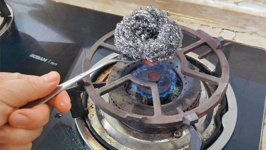 將煤氣灶打開小火,然后用筷子夾住要清潔的鋼絲球,放在火上烤一烤。高溫加熱之后,油脂就會慢慢融化,此時再將它放入洗碗池中熱堿水中,簡單浸泡。